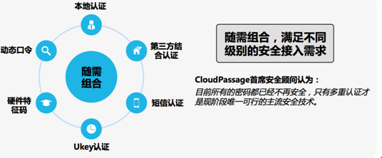 国际云安全权威专家认为,在云时代目前所有的密码都已经不再安全,只有多重认证才是现阶段唯一可行的主流安全技术。所以,为了保障桌面云的接入安全性,桌面云提供了高达6种身份认证方式,包括本地认证、第三方结合认证、短信认证、Ukey认证、硬件特征码、动态口令,并且这些认证方式可以按需自由组合,从而满足不同级别的接入安全需求。