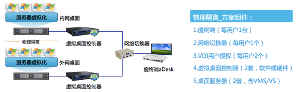 每用户一台瘦终端,通过网络切换器,连接到物理隔离的两套桌面服务器集群,用于访问内网和外网。内网桌面和外网桌面分别部署在两个物理隔离的服务器集群里。