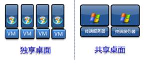 独享桌面:基于服务器虚拟化提供的可远程访问的桌面,即服务器可以根据模板自动为每用户分配一个虚拟机(安装Windows XP、Windows 7等桌面操作系统,并且每个独享桌面相互隔离),用户远程访问自己的虚拟机,并可拥有独立、完全的桌面使用和控制权限。适用于有系统个性化需求、对性能要求高的桌面用户,当然部署独享桌面对服务器和存储资源的要求比较高。