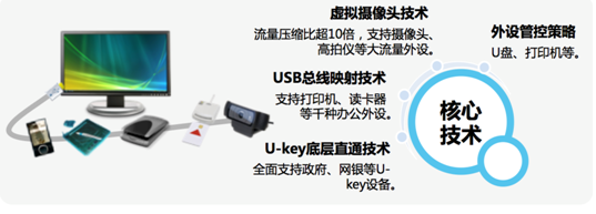 此次桌面云方案允许将外设连接到终端上,外设驱动安装于服务器上,然后可以如本地桌面一样使用各种外设,尽管虚拟桌面是在服务器上运行的。通过总线映射技术在终端连接外设的接口如USB或串口与服务器上的虚拟桌面构建一条专有的隧道,用于传输各种外设的控制指令。在之前测试过程中,桌面云可以完美支持一、二、三代CA证书,影像扫描仪,摄像头,打印机等。