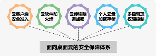 除了解决账户安全问题之外,整个云平台的安全防护也是非常重要的,云安全防护体系,包含了端到端的云安全技术,其中云客户端安全准入策略,可以确保只有授权的网络、操作系统、终端和用户才能接入桌面云平台;内置云软件防火墙模块,可以确保桌面云在内外网都能得到安全防护、免受攻击;同时,在整个桌面云传输过程中,所有数据全程加密以确保信息安全性;另外,“用户数据盘加密”技术,可对个人数据采取加密手段,这样不管是IT管理员、还是非法用户,都无法看到其他用户的数据,保障用户个人隐私的安全性。