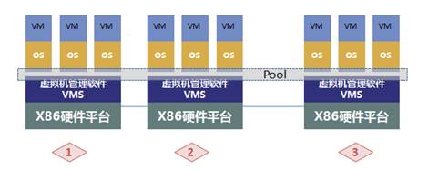 每台服务器都安装虚拟机管理软件VMS,将底层物理资源如CPU、内存、磁盘、I/O等抽象成逻辑资源,形成动态管理的“资源池”,并根据实际需要创建合适的虚拟服务器VM,每台VM可提供独立的桌面环境。