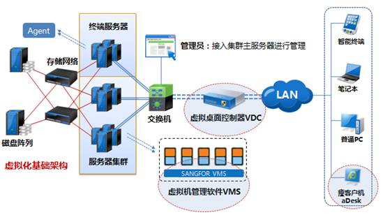 l 为高效,稳定的对各个虚拟桌面进行集中管控,在核心交换机旁挂一台虚拟桌面控制器VDC。